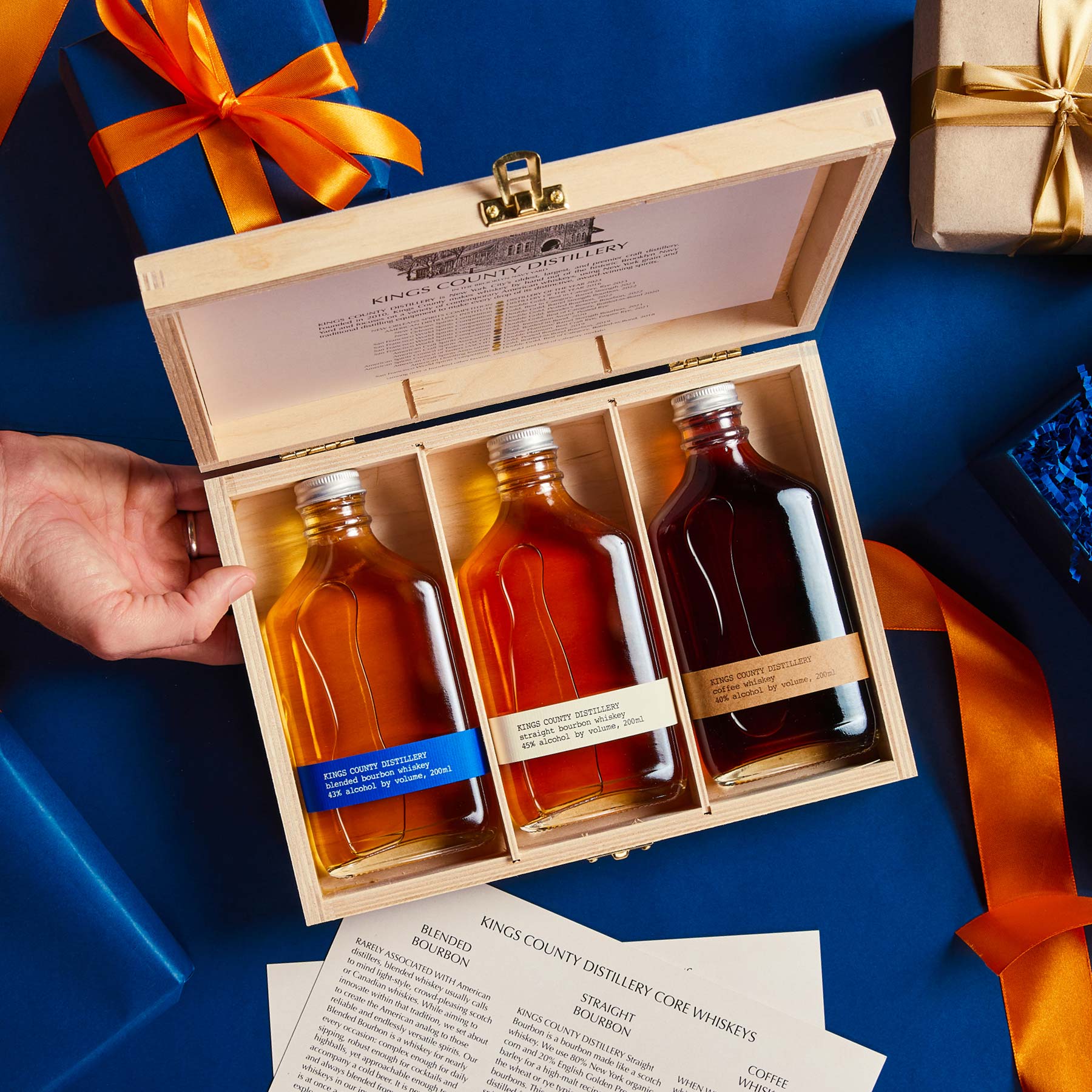 As genuinely handmade whiskeys, our bottles work great as gifts, but often buyers don't know the taste preferences of the person they are gifting. We created these handsome, understated gift sets that present a selection of our whiskeys in an elegant, giftable set that shows the best of what our distillery can do. It's a tasting in a box with more of an experience than a single bottle, featuring three 200ml bottles. The Core Whiskey Gift set highlights three essential Kings County whiskeys in our portfolio: Straight Bourbon, Blended Bourbon, & Coffee Whiskey.